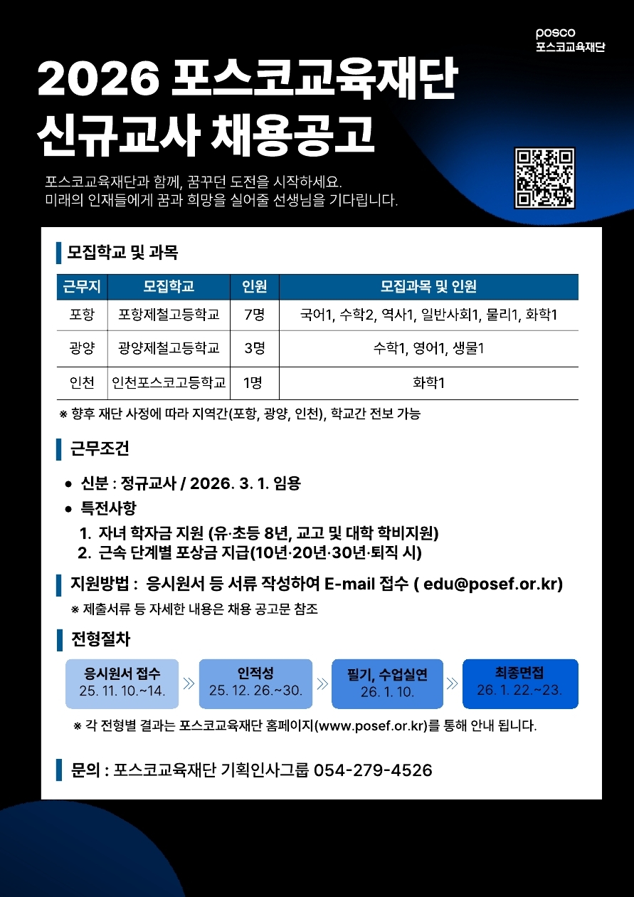fnctId=bbs,fnctNo=2344 글번호 939172 [채용정보] 2026 포스코교육재단 신규교사 채용공고_정규교사 '26. 3. 1. 임용 작성일 2025.11.07 수정일 2025.11.07 작성자 사범대학 조회수 4391 첨부파일 2026학년도 교원 신규채용 공고문(중등 자체).pdf 미리보기 제출서류 서식(응시원서 등).hwp 미리보기 다음글 [채용정보] 2026학년도 학교법인 세그루학원 선덕고등학교 신규교원 채용 공고_정규교사 '26. 3. 1. 임용 정성희 2025-11-11 09:29:33.0 이전글 [취업정보] 2025 전남대학교 JOB FESTA 개최 안내 정성희 2025-10-21 15:35:50.0